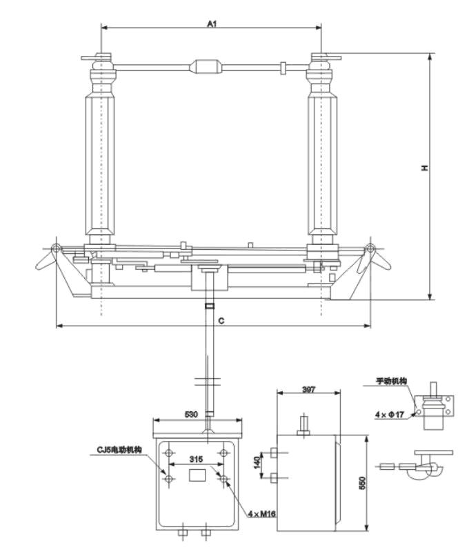 隔离开关由底座.绝缘支柱及导电部分以及操动机构等组成。每极有两个支柱, 每个支柱上端各装有导电闸刀.两部分闸刀触头接触处在两支柱的中间部位。 支柱的下端各装有轴承套,在操动机构的带动下,可使闸刀作水平旋转90度,从而达到分合闸之要求。隔离开关为单极 型,也可通过连杆将三极连成能够联动的三极型式。配用CS11(不接地)CS8-6D(单接地) CS17(双接地)型手动机构操作。(可根据需要配电动机构)从上述结构简介中不难看出,本隔离开关结构合理,操动灵活自如;可单极,也 可三极使用,安装方便;触也开距大,绝缘安全可靠。还可根据用户需要,不接地或配装单边接地或双接地均可。